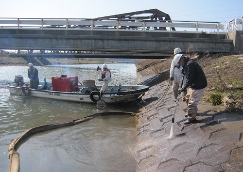 油の流出事故等により油が付着した岸壁等の洗浄作業を行います。...